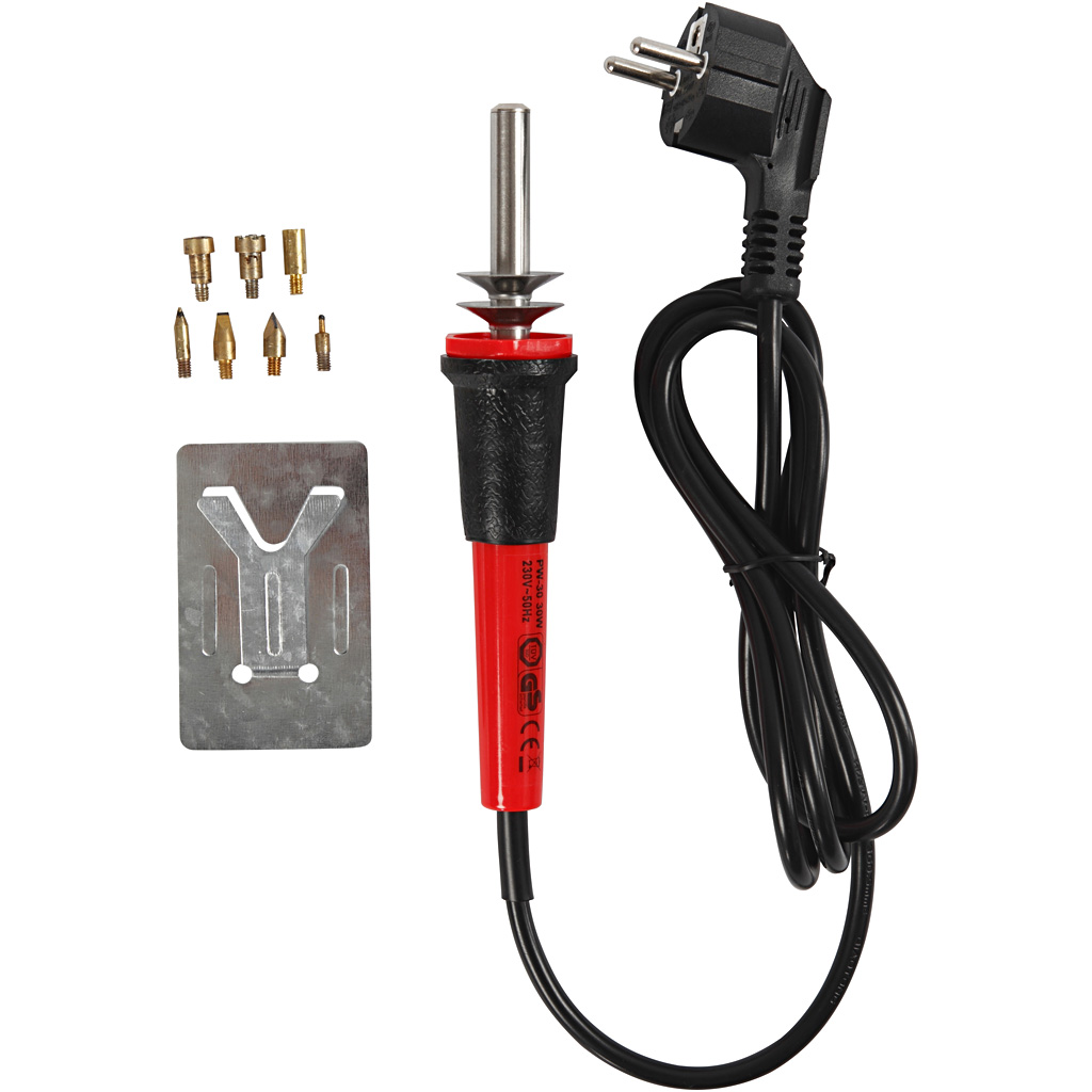 Elektrisches Werkzeug mit auswechselbaren Metallnadeln zum Einbrennen von Schrift und Motiven in Kork, Leder und Holz. Ständer und Glühnadeln sowie Motive und Vorlagen für freihändiges Brennen sind im Set enthalten