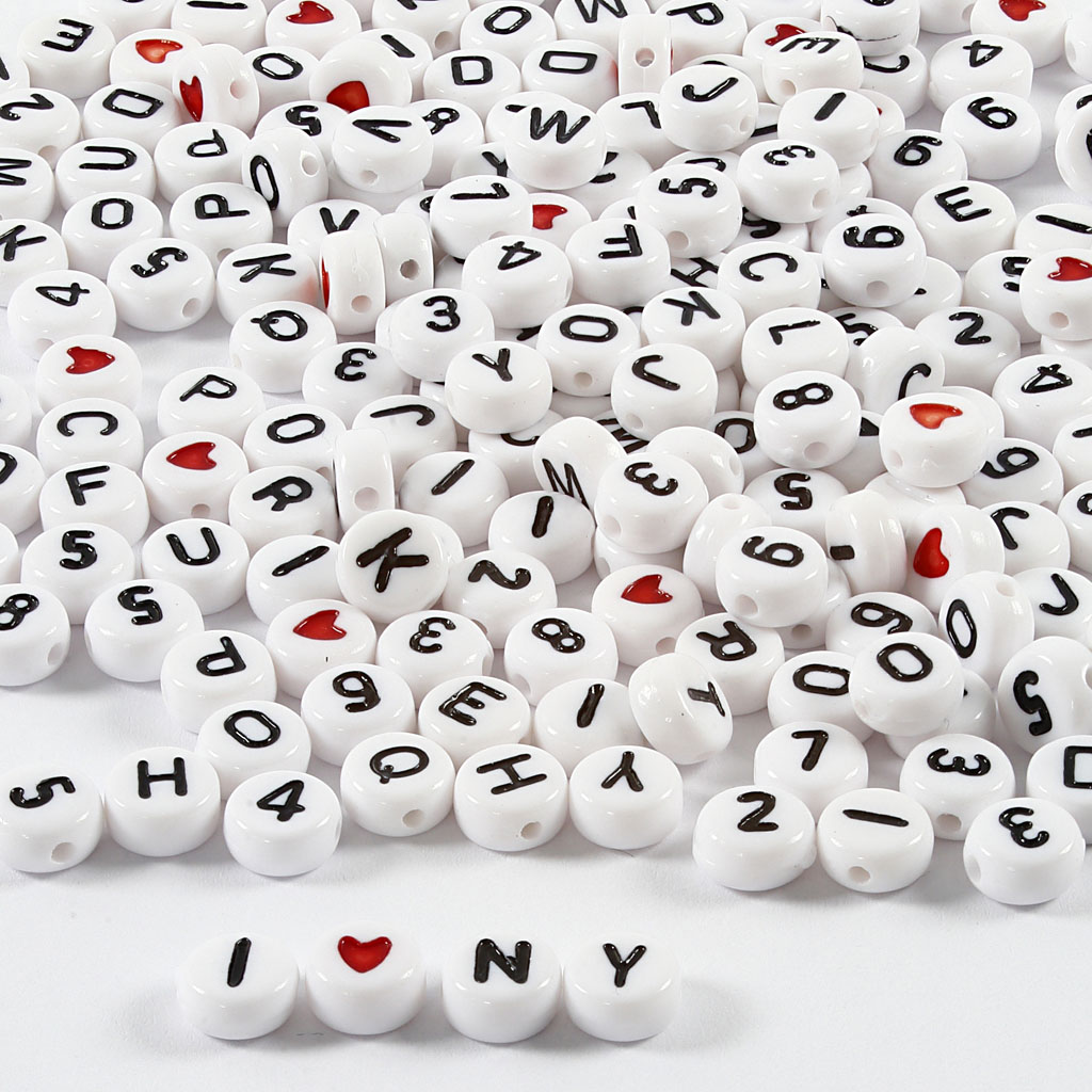 Runde Perlen aus weißem Kunststoff mit flacher Vorder- und Rückseite – bedruckt mit bunten Buchstaben des Alphabets (A-Z)