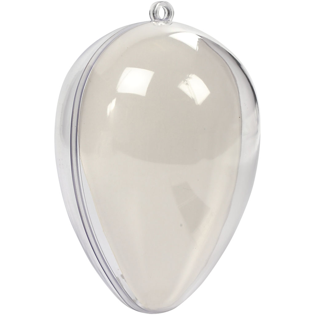 Zweiteiliges Acryl-Ei zum Aufhängen – zum Bemalen mit Farbe oder zum Befüllen mit Dekomaterial oder Sammelstücken. Das Ei enthält kleine Pappscheiben zum Verzieren, Beschriften oder Bekleben
