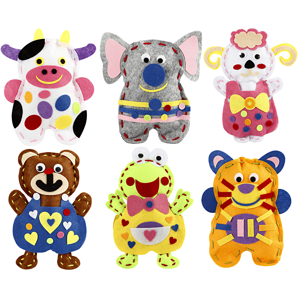 Jedes Set enthält alles, was man zum Basteln einer lustigen Filz-Figur benötigt. Die vorgeschnittenen Filzteile haben gelochte Kanten zum einfachen Zusammennähen. Die Deko-Elemente sind selbstklebend