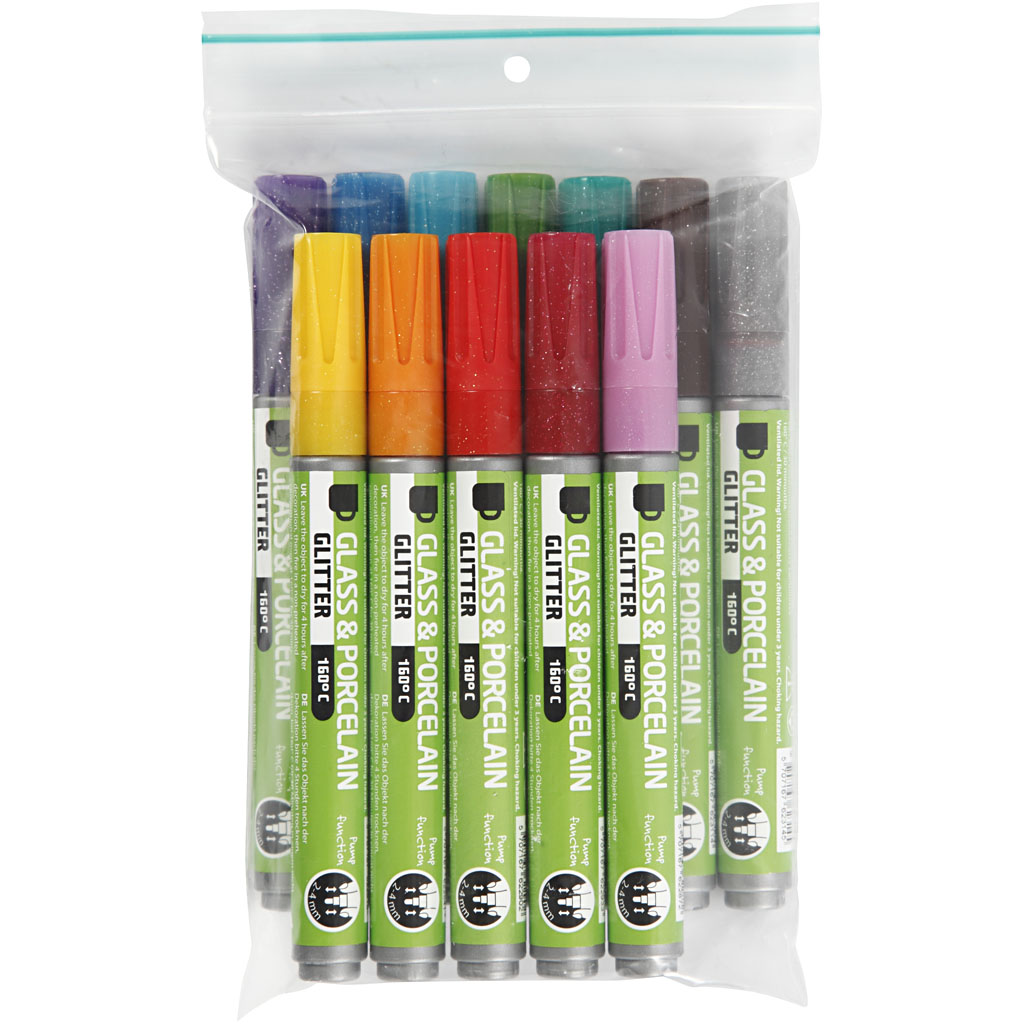 Halbdeckender Filzstift auf Wasserbasis mit Glitter – für Glas, Porzellan, Metall – Trocknungszeit: 4 Stunden, danach bei 160°C 30 Min. lang im (nicht vorgeheizten) normalen Backofen aushärten. Farbe ist dann spülmaschinenfest