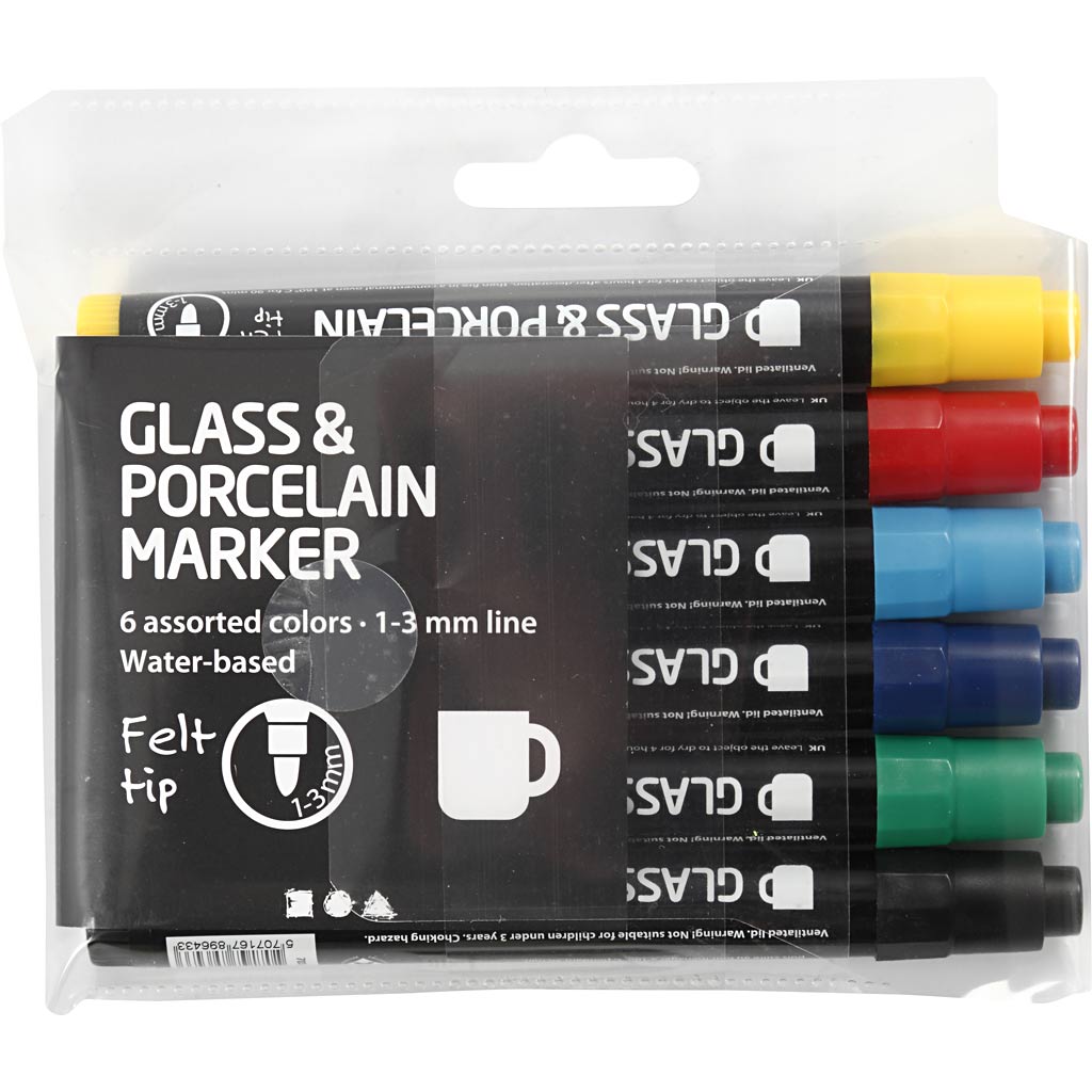 Halbdeckender Marker auf Wasserbasis mit fester Filzspitze für Glas und Porzellan. Nach dem Aushärten im Ofen kann das Objekt mit einem Schonprogramm in der Spülmaschine gespült werden