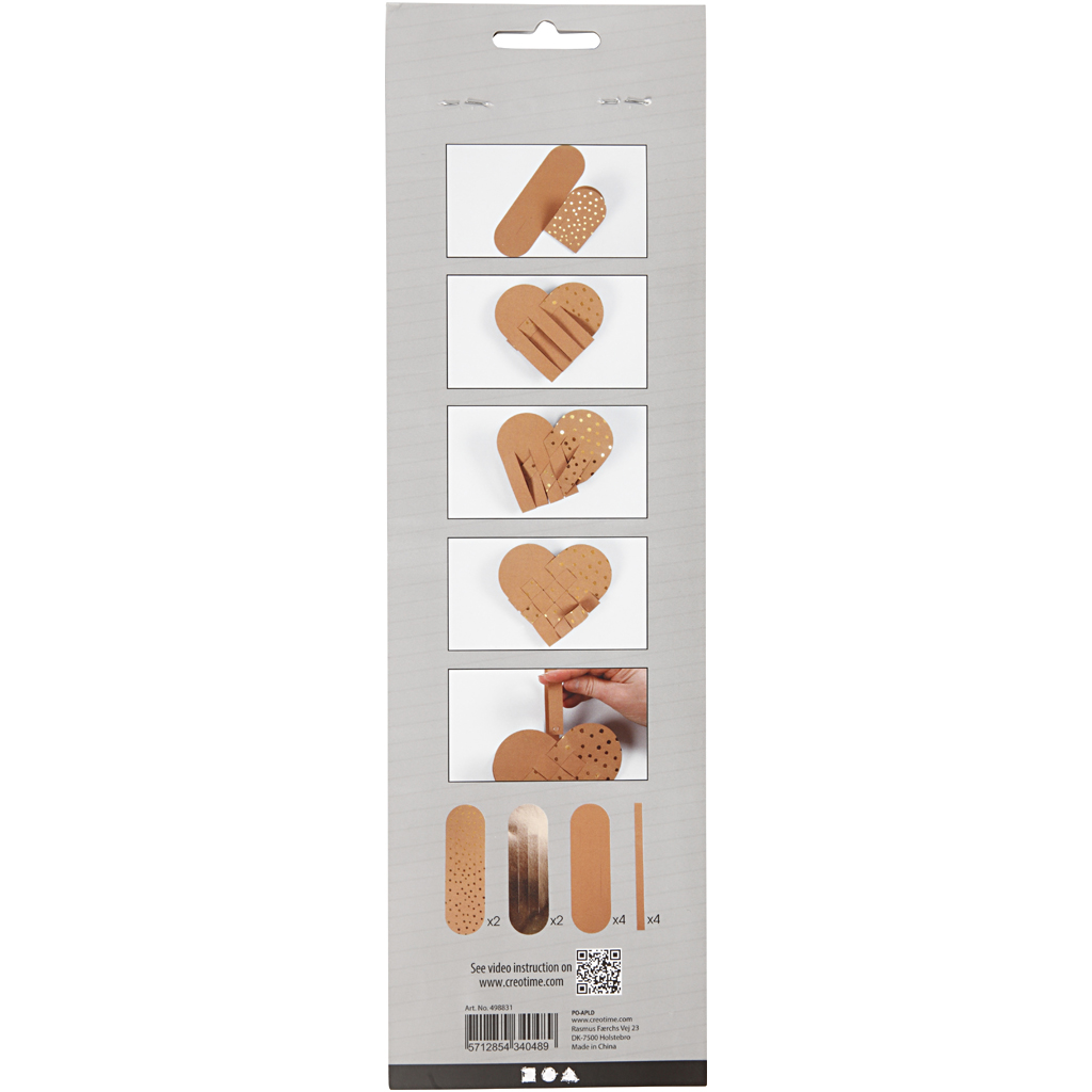Materialset mit Stanzformen für 4 Flechtherzen in 3 verschd. Designs – mischbar – inkl. Aufhänger. Inhalt: Stanz-Vorlagen für 2 Herzen in “Natur”, 1 Herz in “Gold” und ein Herz in “Natur mit Goldprint”, 4 Aufhänger, Anleitung