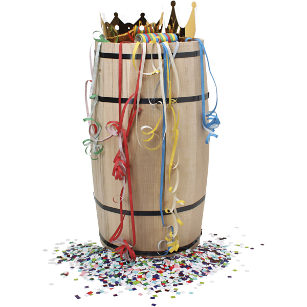 Set mit Fass, Stock, Kronen und buntem Dekor für die Karnevalsfeier