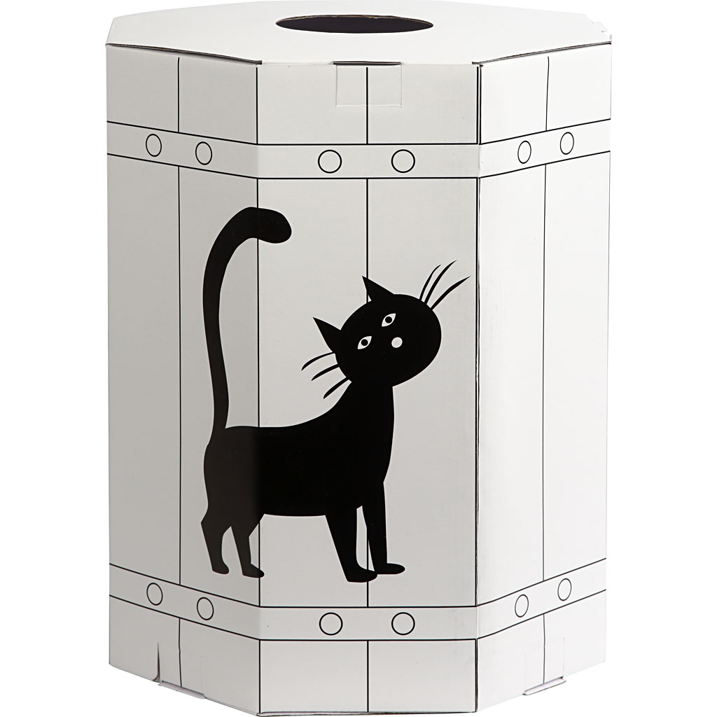 Sechseckiges Fass aus starker weißer Pappe – der Deckel hat eine 10 cm große Öffnung zum Befüllen, an zwei Seiten befinden sich 1 cm große Löcher zum Aufhängen. Lieferung zusammengelegt.
