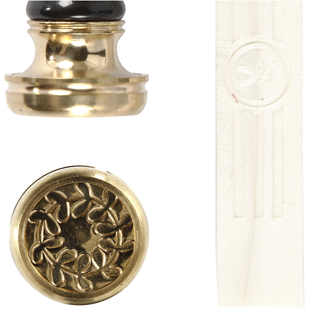 Set aus Siegellack und Griffstück mit Siegel (Petschaft) – Siegelmotiv: Lorbeerkranz. Der Siegellack wird geschmolzen, auf die gewünschte Stelle getropft, dann das Petschaft in den noch warmen Lack gedrückt – Lackmenge für 10 Siegel