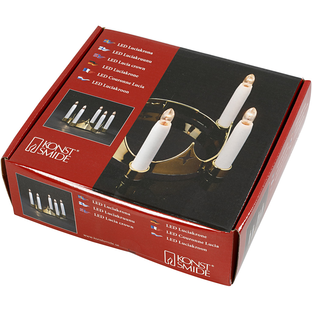Batteriebetriebene, verstellbare Plastikkrone mit 5 Kerzen – perfekt als Lucia-Krone. Mit 5 Plastik-LED-Birnen (Lebensdauer ca. 30.000 Stunden). Bedarf: 5 AA-Batterien 1,5 V (Artikel-Nr. 14000 – nicht im Lieferumfang enthalten)