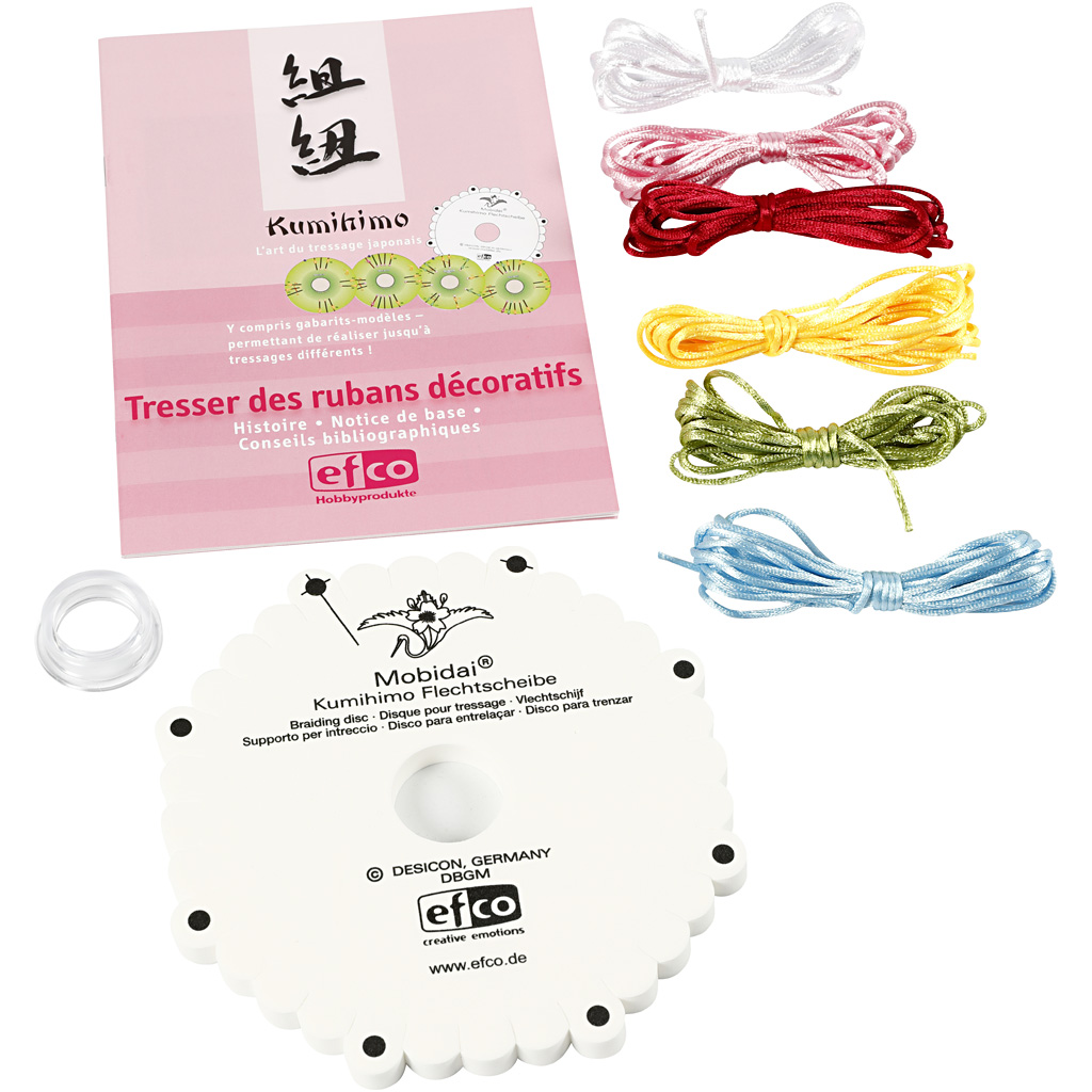 Das Set enthält 1 Mobidai® Kumihimo Flechtscheibe, 2 Musterschablonen und Satinkordel in 6 Farben à 3 m. Super-Bastelwerkzeug für alle, die gerne flechten