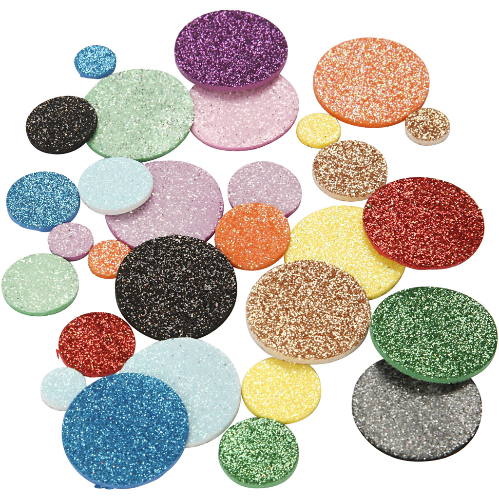 Selbstklebende, ausgestanzte Kreise mit Glitter in weichem, schaumstoffähnlichen Material