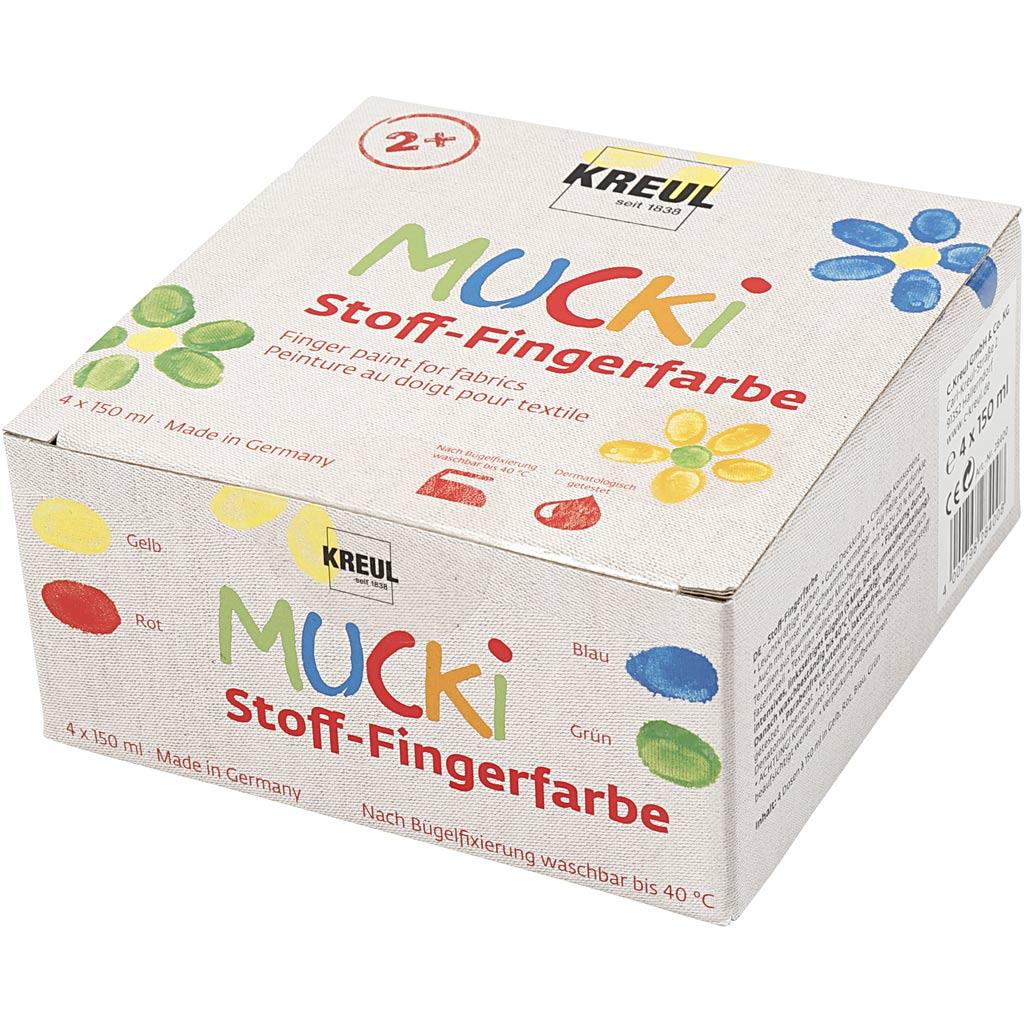 Sortiment an Fingerfarben auf Wasserbasis zum Bemalen von Textilien in gute Qualität – geeignet für Kinder. Die Farbe muss nach dem Auftragen 24 Stunden trocknen und zusätzlich bügelfixiert werden, wenn der Stoff für Maschinenwäsche bei 40°C waschbar gemacht werden soll
