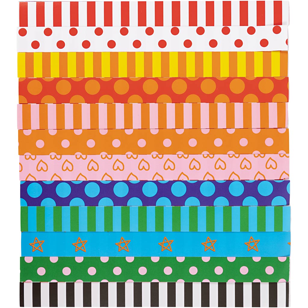 Papierketten aus Glanzpapier in hellen, kräftigen Farben – eine Seite glänzend, die andere Weiß. Pck. mit 12 verschiedenen Designs