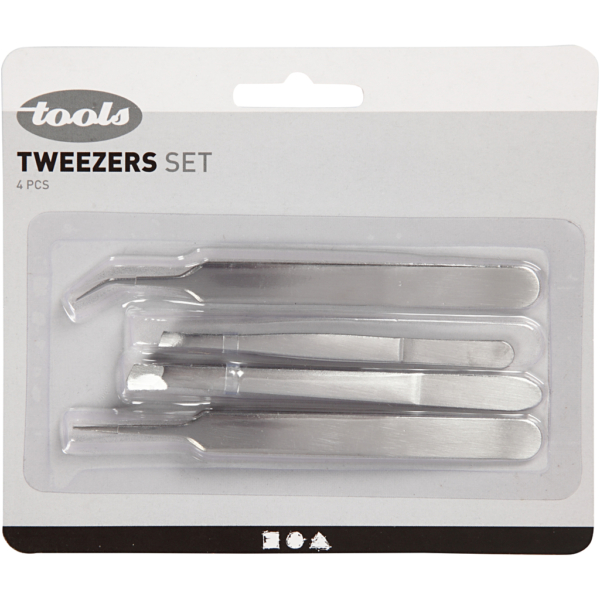 Das Set enthält 4 verschiedene Pinzetten aus Metall