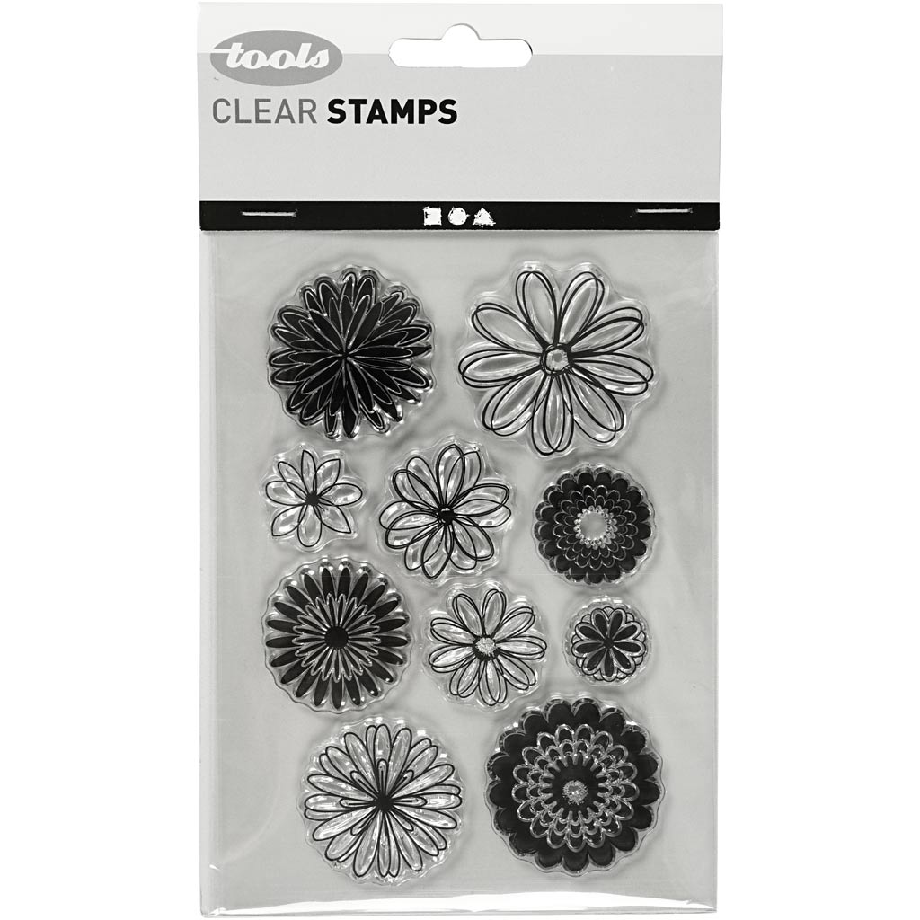 Bogen mit verschd. Stempelmotiven aus transparentem Silikon – selbstklebend – mit Acrylblock als Unterlage (Art. Nr. 21586, 21587 oder 21588) lassen sich die Motive als Stempel verwenden