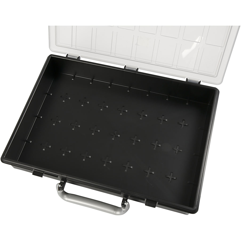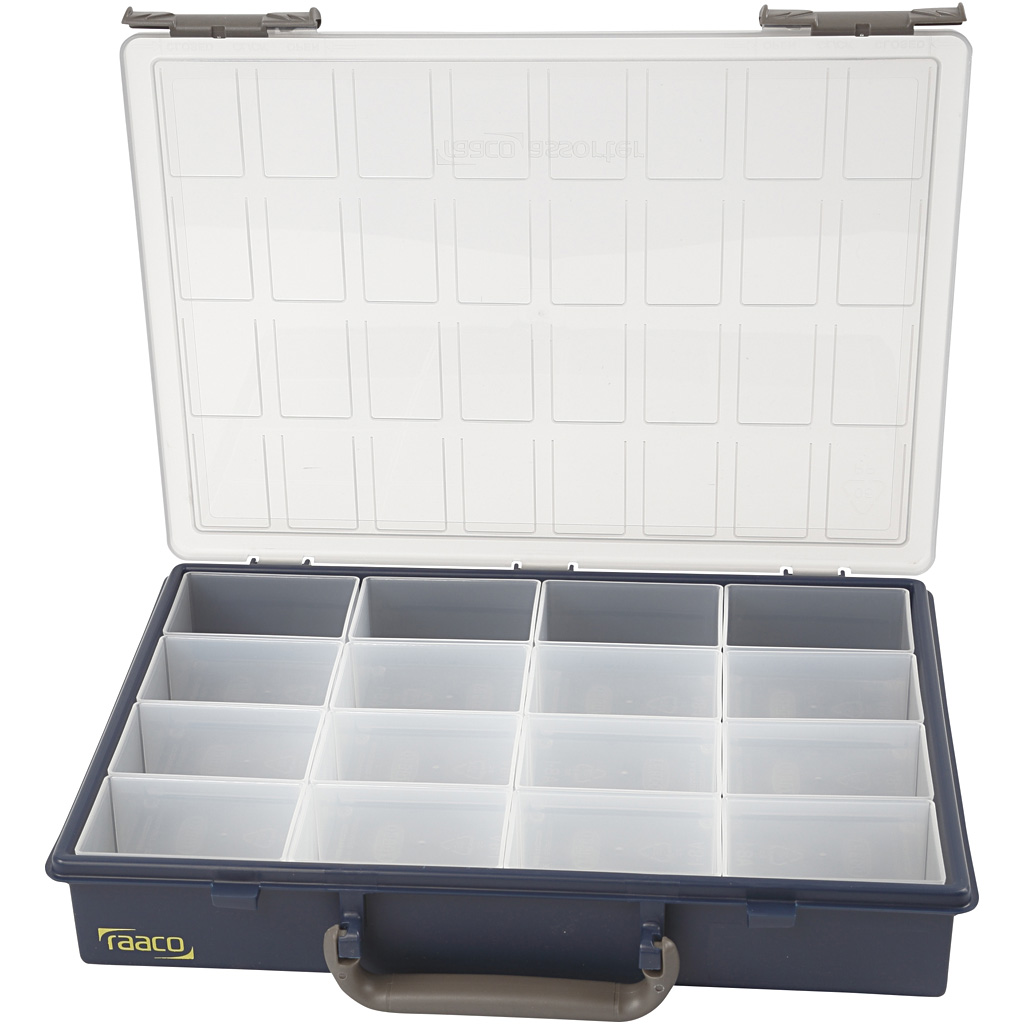 Raaco – aus Polypropylen (PP) – mit Schiebeverschluß und 16 losen Einsetz-Boxen. Kann mit kleinen Einsetzkästchen unterteilt werden