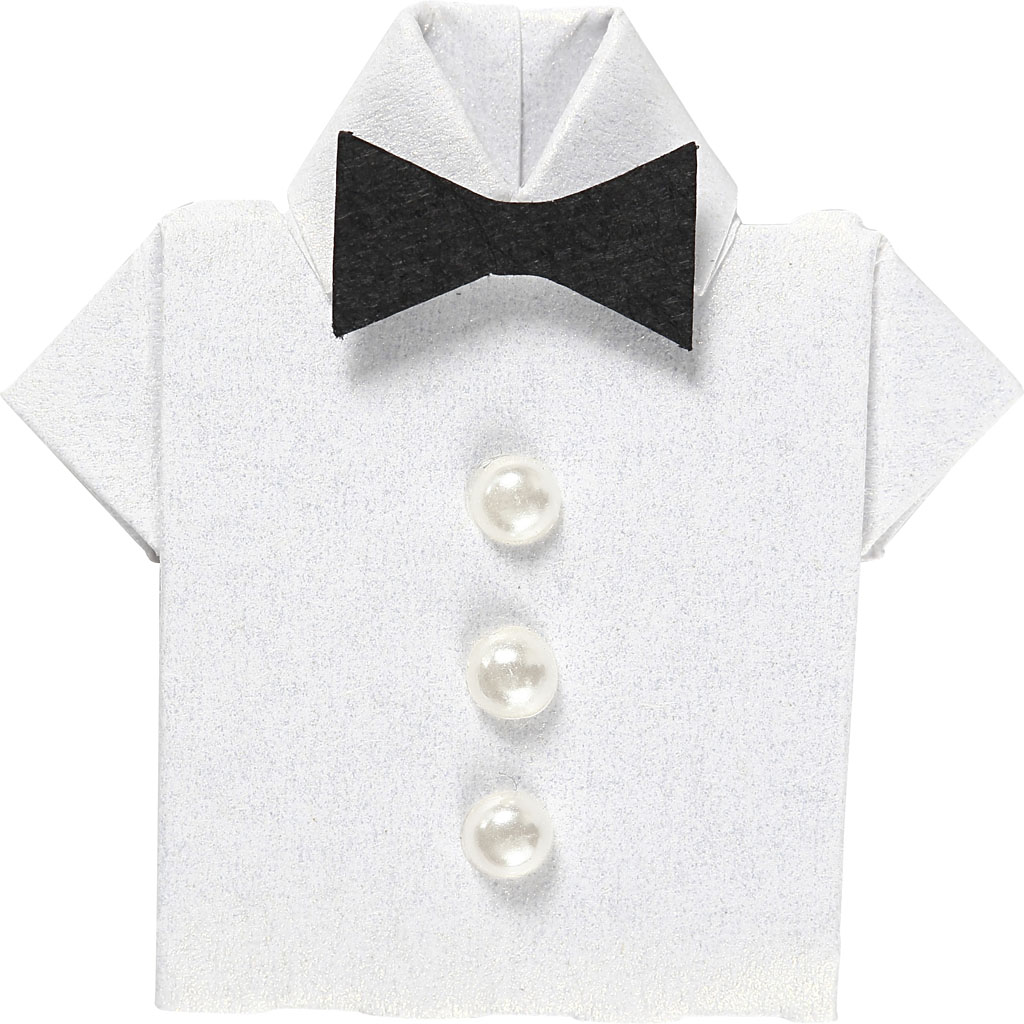 Sticker in Kleiderform mit Klebe-Pads auf der Rückseite für einen 3D-Effekt. Die Kleider sind in Origami-Technik gefaltet – mit besonders feinen Details aus weißem Papier, schwarzer Fliege und kleinen Perlen als Knöpfe