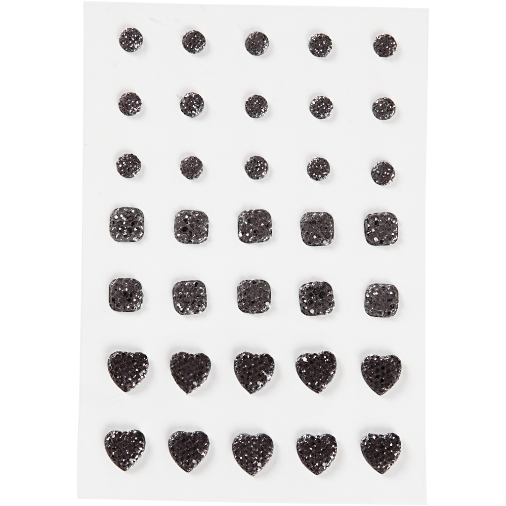 Strasssteine, rund, quadratisch, herzförmig, Größe 6+8+10 mm, Schwarz, 35 Stk/ 1 Pck