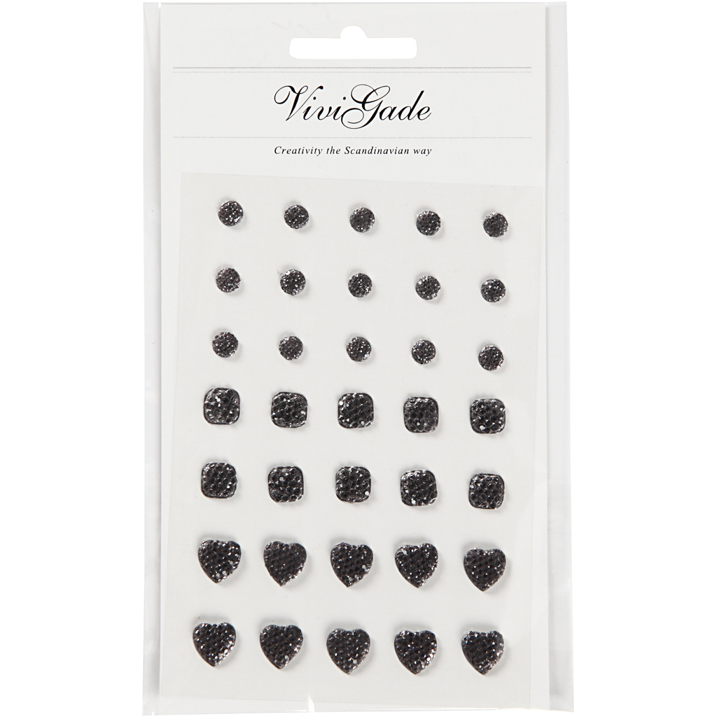 Sortiment selbstklebender Strasssteine auf Trägerfolien – 3 Varianten (rund, quadratisch, herzförmig) – gewölbte Vorder- und flache Rückseiten – Design Vivi Gade