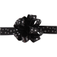 Effektvolles Band mit silbernen Punkten und einer schmalen Kordel, die sich durch die Bandmitte zieht. Strafft man die Kordel, bildet sich eine bauschige Schleife