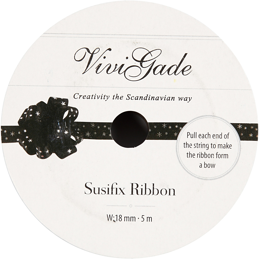 Effektvolles Band mit silbernen Punkten und einer schmalen Kordel, die sich durch die Bandmitte zieht. Strafft man die Kordel, bildet sich eine bauschige Schleife