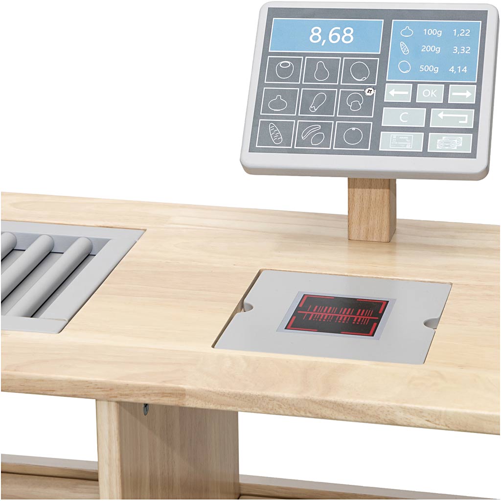 Feste Theke aus Holz, ideal für Kinder, die Einkaufen spielen. Voller realistischer Details wie Kassenband und Scanner für jede Menge Spaß beim Rollenspiel