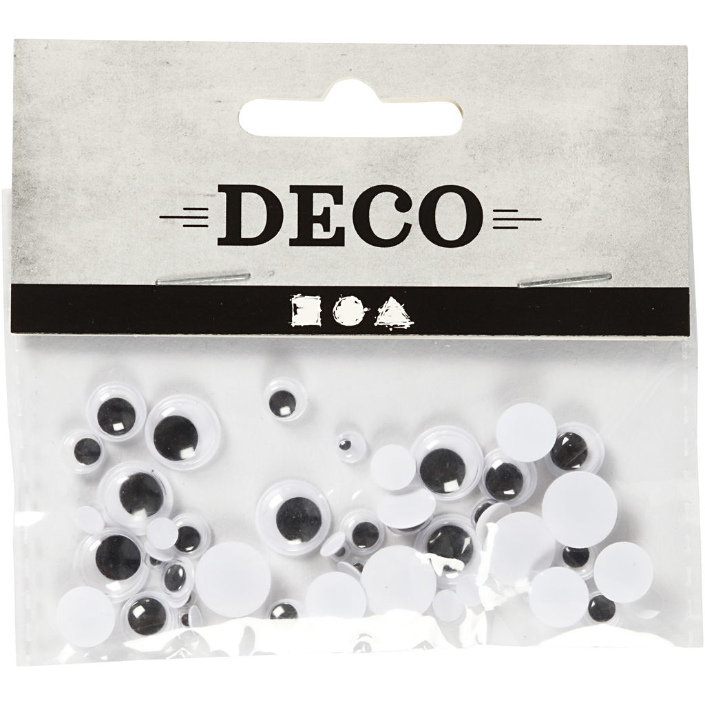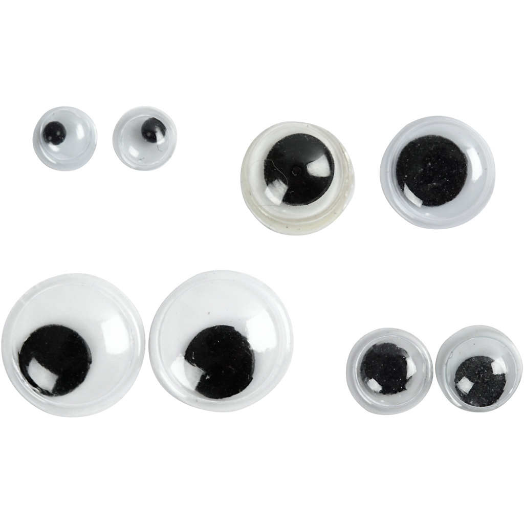Wackelaugen mit beweglichen Pupillen, die Sie für alles verwenden können, was einen lustigen Look bekommen soll. Die Augen haben eine flache, nicht klebende Rückseite