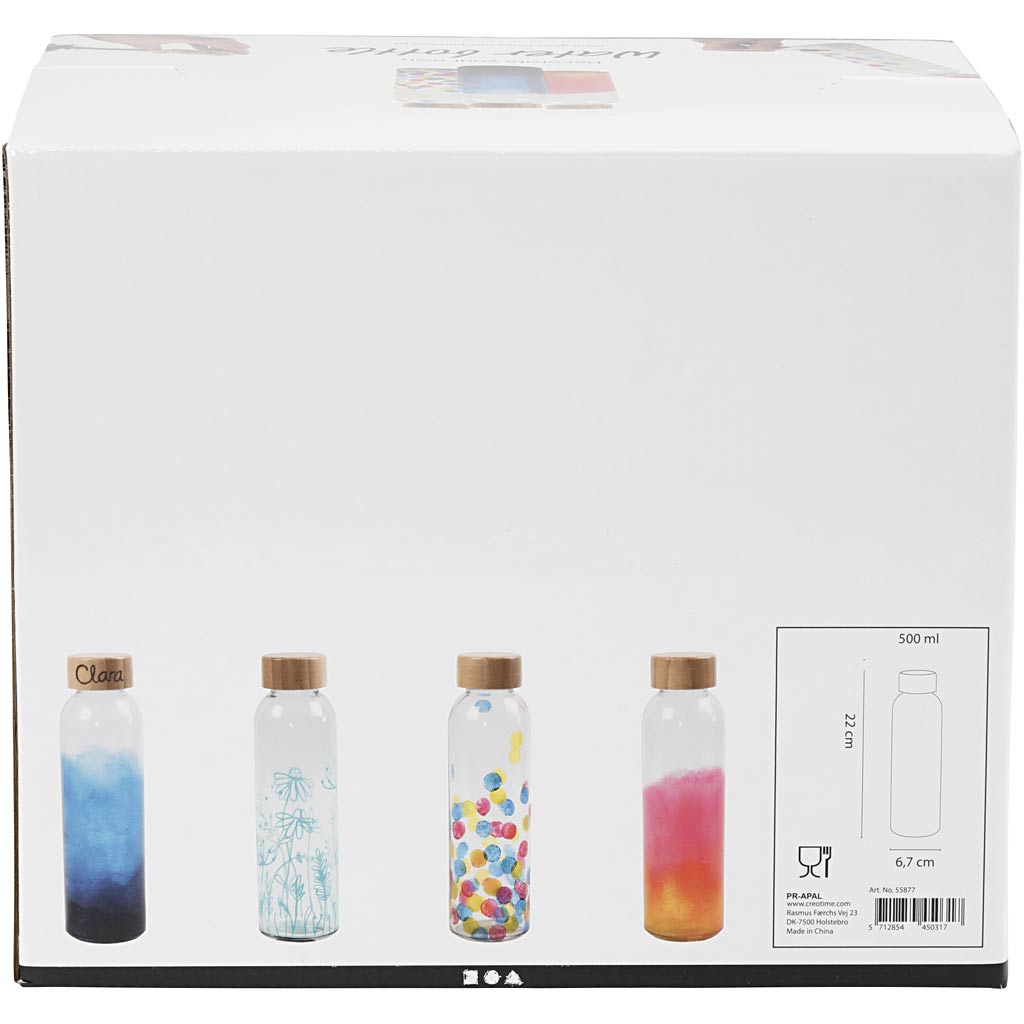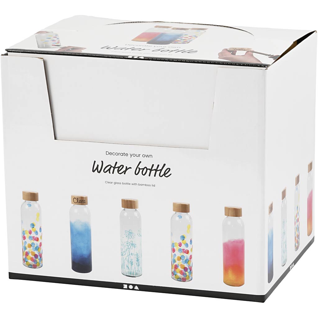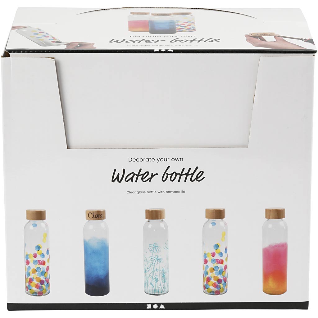 Diese wiederverwendbare Trinkflasche aus klarem Glas mit Bambusdeckel ist eine gute Alternative zur Einwegflasche. Man kann sie hervorragend individuell gestalten – z. B. das Glas mit Markern für Glas-/Porzellan, den Bambusdeckel mit einem Brennmalstift für Holz