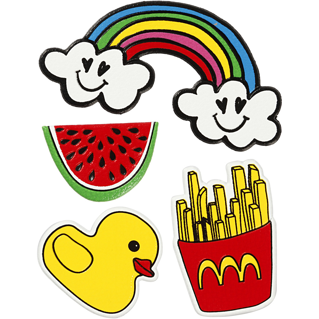 Selbstklebende Aufkleber aus Plastik – bedruckt mit farbenfrohen Motiven. Zum Dekorieren von Taschen, Handycovern und Schuhen