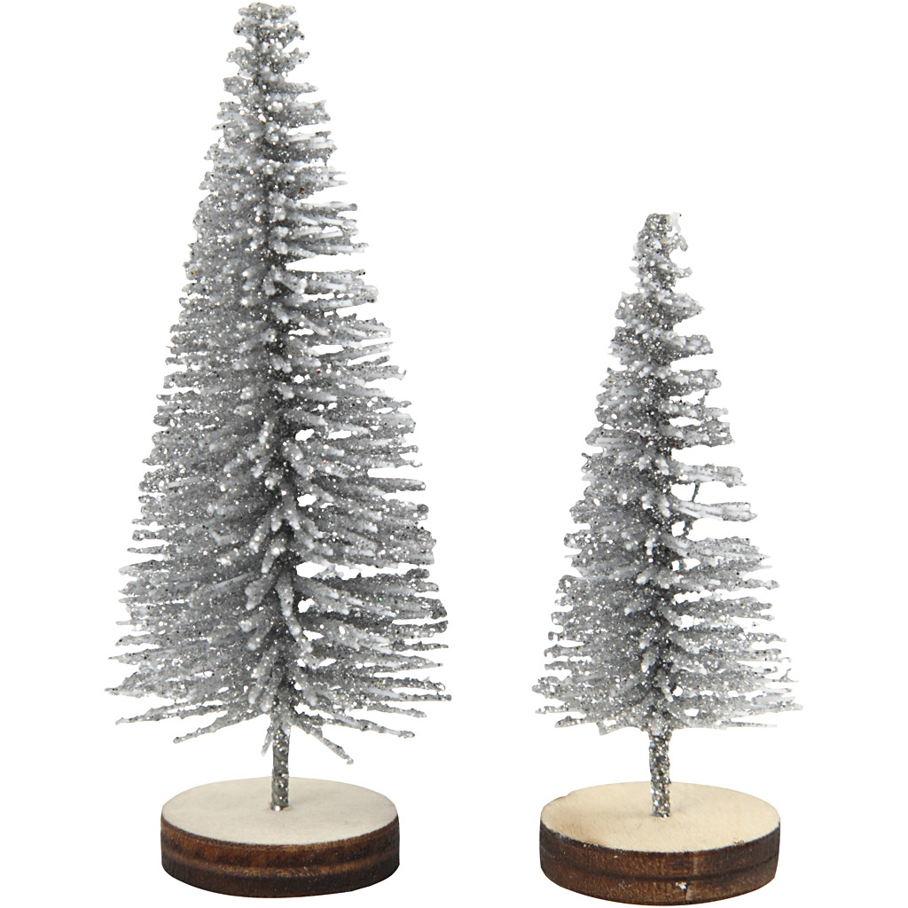 Kleine Tannen aus Nylon-Borsten und gedrehtem Draht – mit kleinen Holztellern für den festen Stand – zur Gestaltung von weihnachtlichen Landschaften auf Fensterbänken o.ä