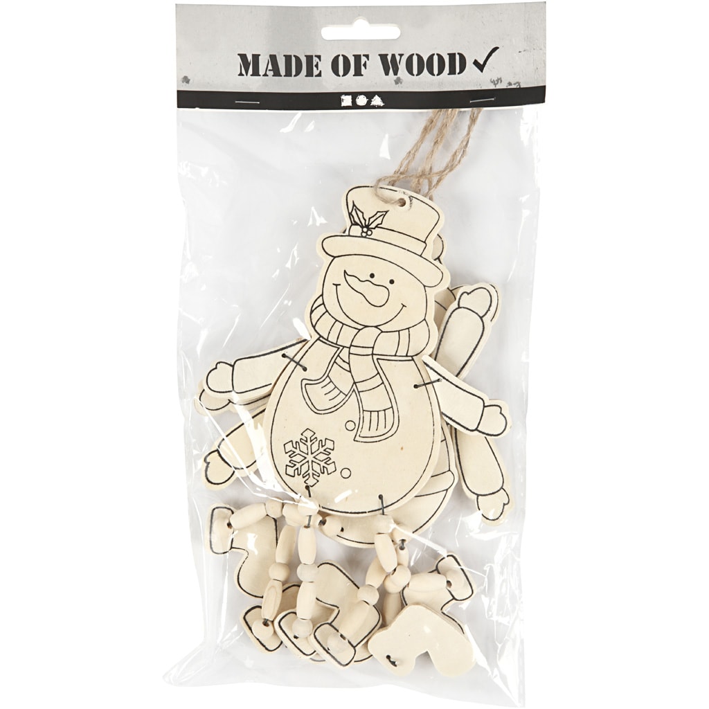 Ornamente zum Aufhängen – aus hellem Holz – mit Weihnachtsmotiv auf der Vorderseite und Beinen aus Holzperlen