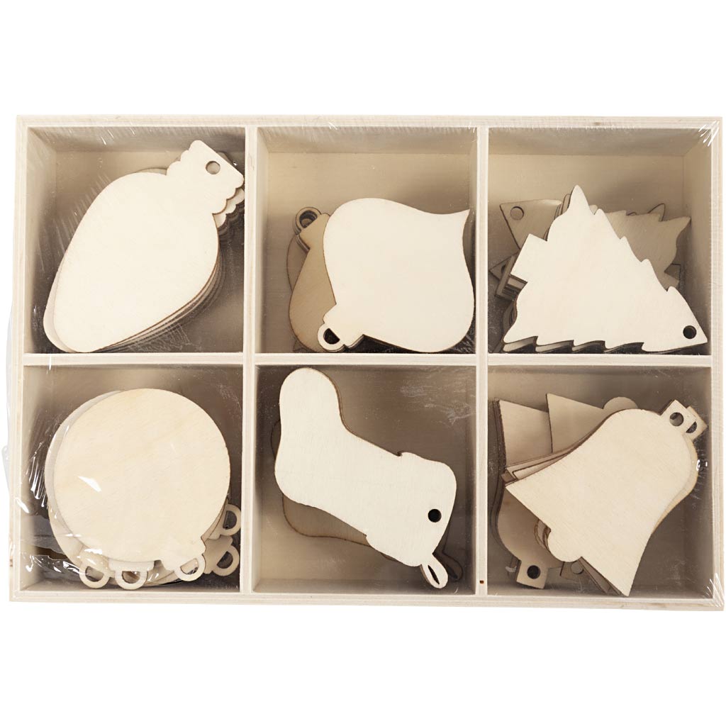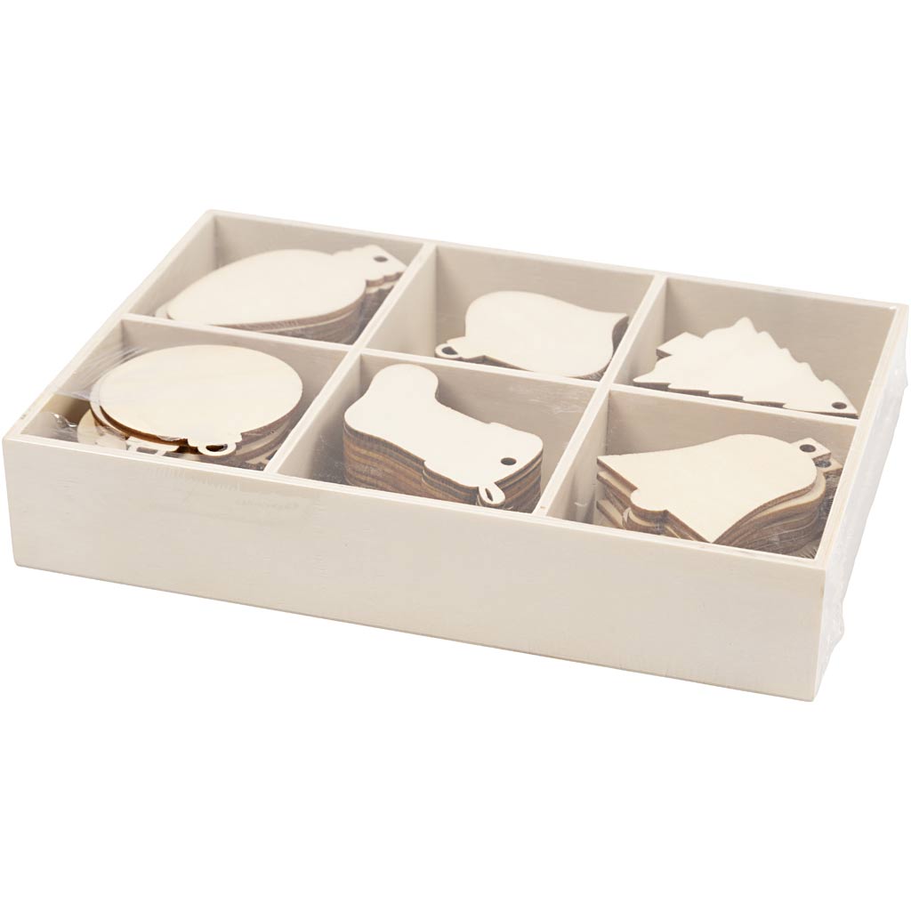 Flache, ausgeschnittene Figuren aus Holz mit einem gestanzten Loch für die Aufhängeschnur, zum Dekorieren und Aufhängen